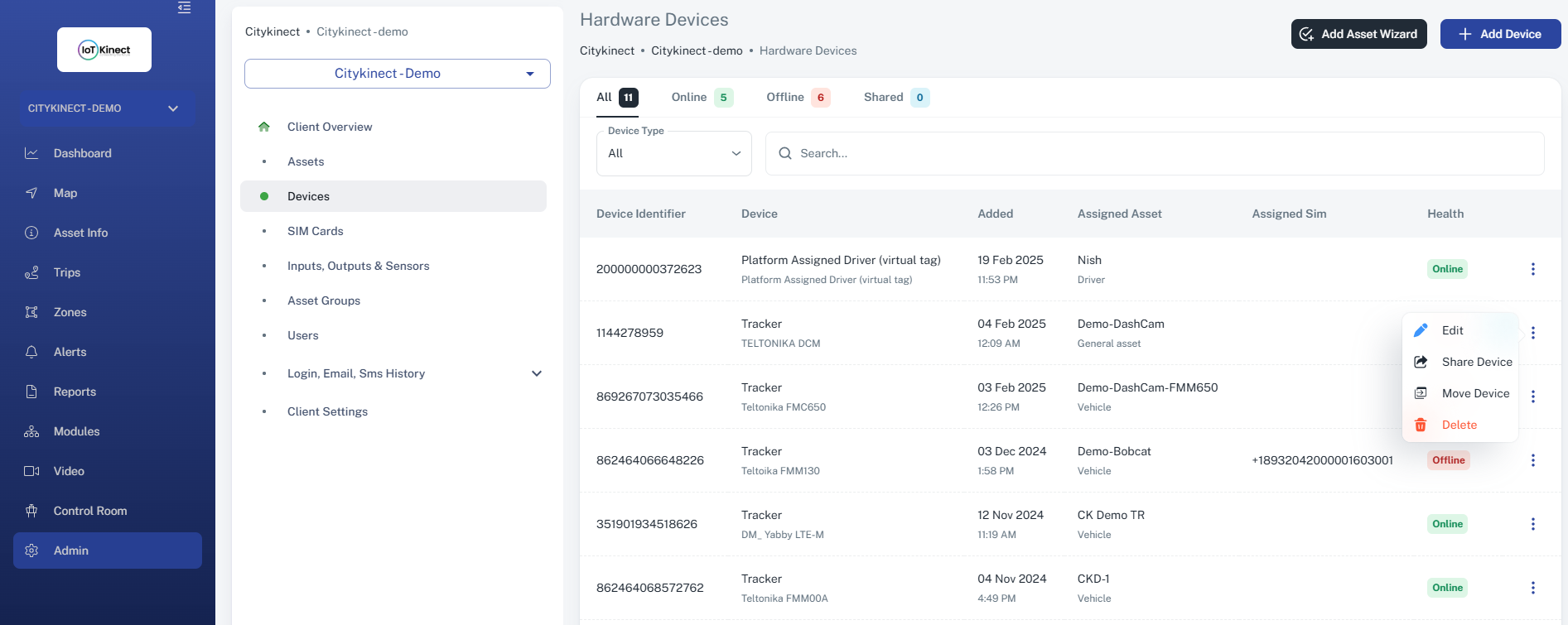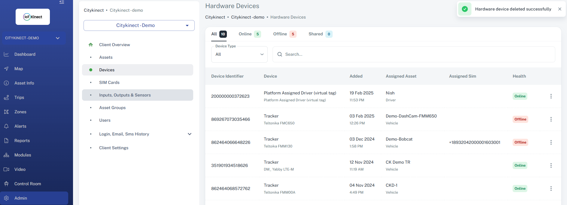 Before deleting a device, ensure that you disassociate any assets and SIM cards from the hardware device.