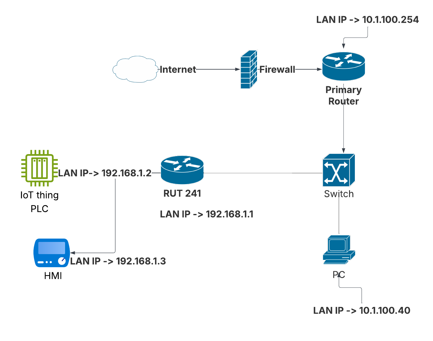 Assign fixed IPs to both the router's WAN and LAN interfaces, as well as to the connected LAN devices. In this specific example, we are using a PLC and HMI connected behind a Teltonika RUT241 router.